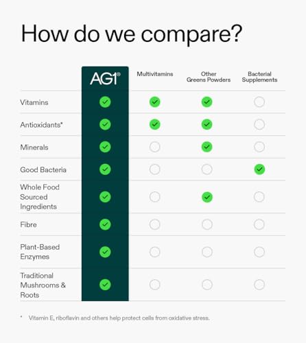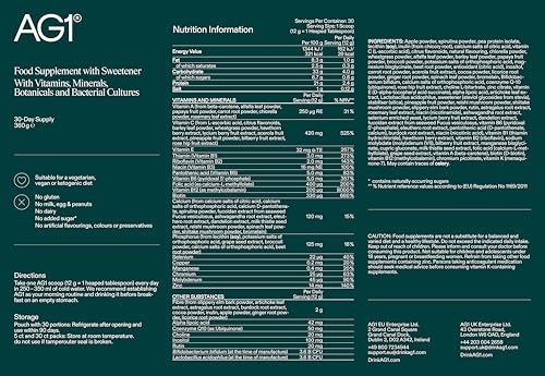 FOR PEOPLE AGED 18+: AG1 is appropriate for quite a lot of diets and life, together with paleo, keto, low-carb, vegan, vegetarian, and intermittent fasting, with no added sugar (comprises low naturally occuring sugar). Gluten-free, Dairy-free, Egg-free, Peanut-free, Lactose-Free, No synthetic colours, No synthetic flavors, No synthetic sweeteners, No added sugar, No GMOs, No animal byproducts.